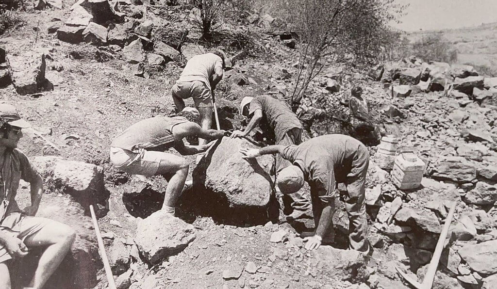 The beginning of the excavation. The diggers are trying to move stubborn rock. From the book “GAMLA – A CITY IN REBELLION”, SHMARYA GUTMAN, 1994.