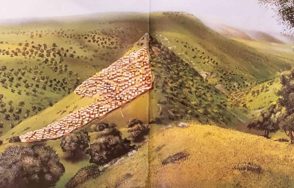 An illustration of Gamla as it looked in the first century AD. From the book “GAMLA – A CITY IN REBELLION”, SHMARYA GUTMAN, 1994. illustratrated by Tuvya kurtz
